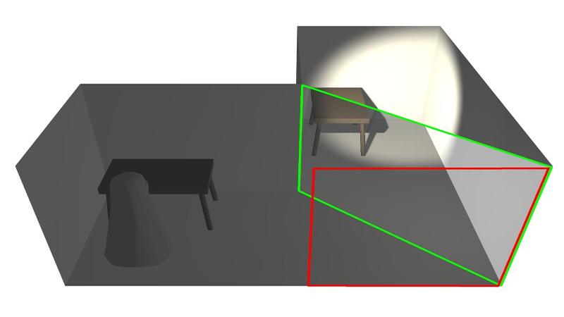如果镜像室(左)变暗,它在玻璃中的反射逐渐消失。空房间(上部)灯光明亮,观众仅能观看道上部房间内的场景。