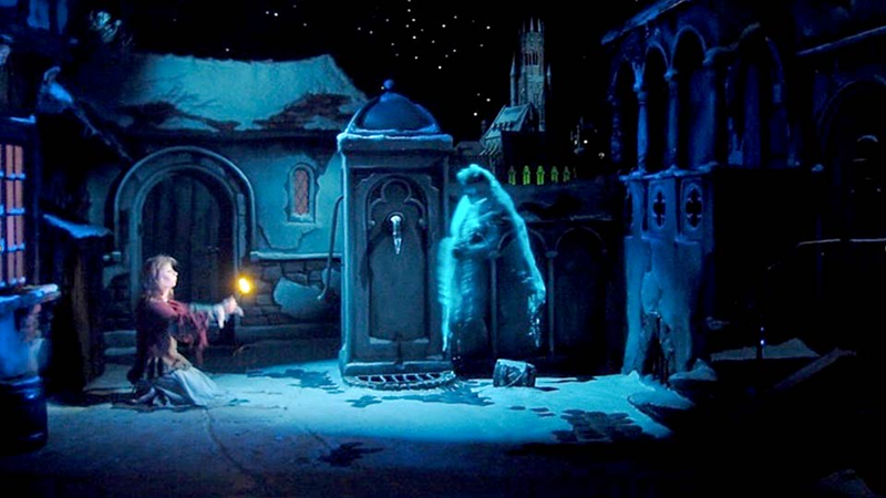 当镜像室中的灯光亮度提升时(上部空房间稍微调暗以进行补偿),呈现的效果则为鬼魂逐步呈现出来。