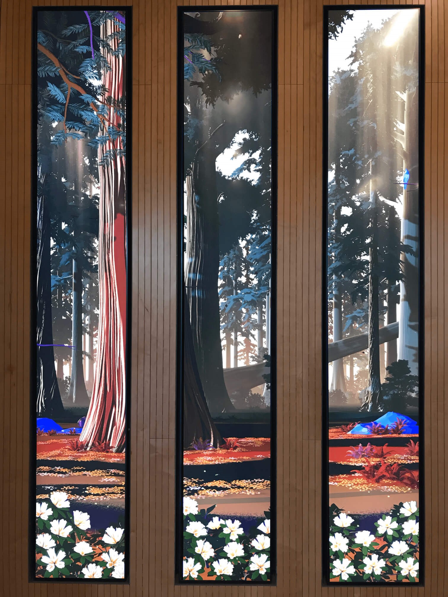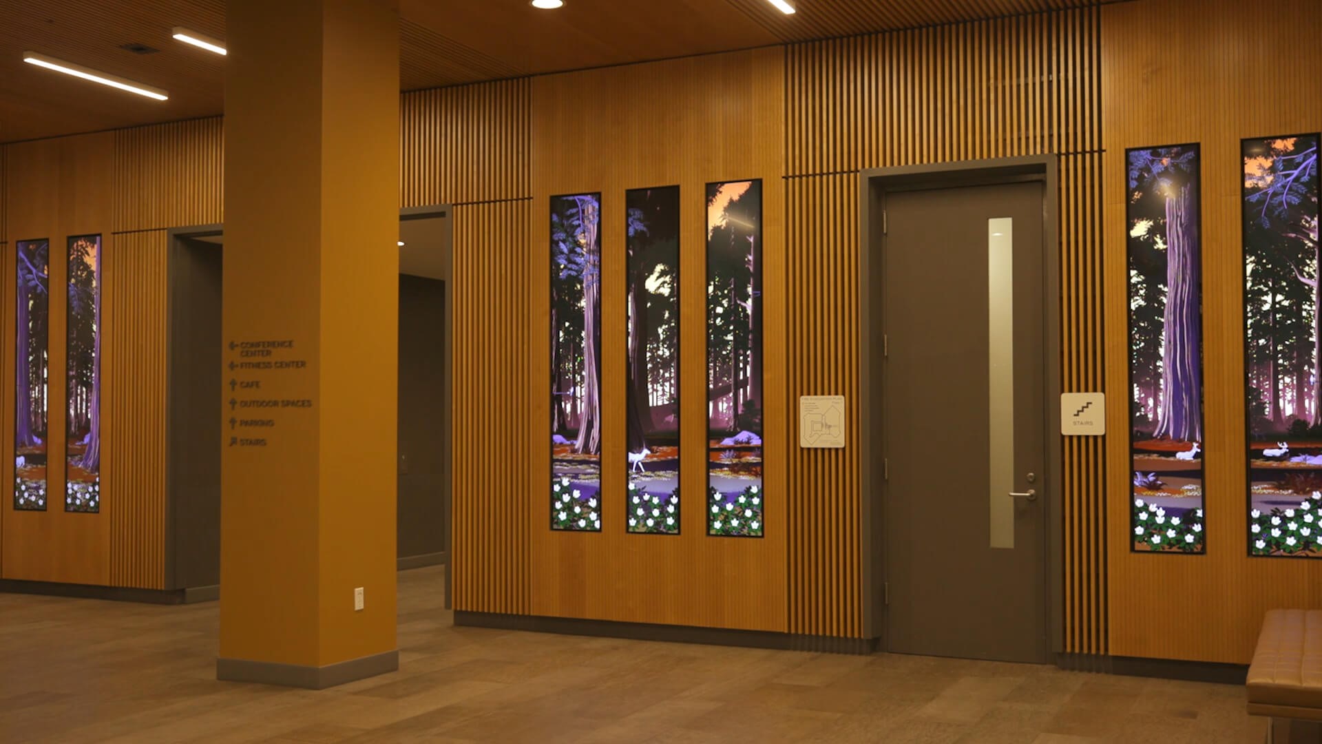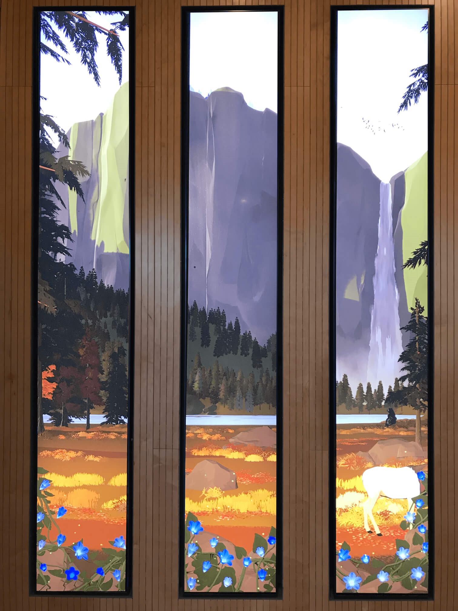 加利福尼亚州圣马特奥大厅的多媒体互动装置以加利福尼亚环境为特色,这些环境中有动物、植物,可对游客的活动作出反应。该空间采用定制3D渲染风格,模仿国家公园管理局海报,根据一天中的时间改变颜色和照明。