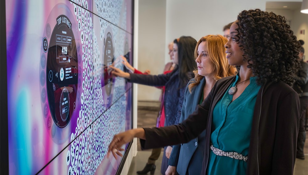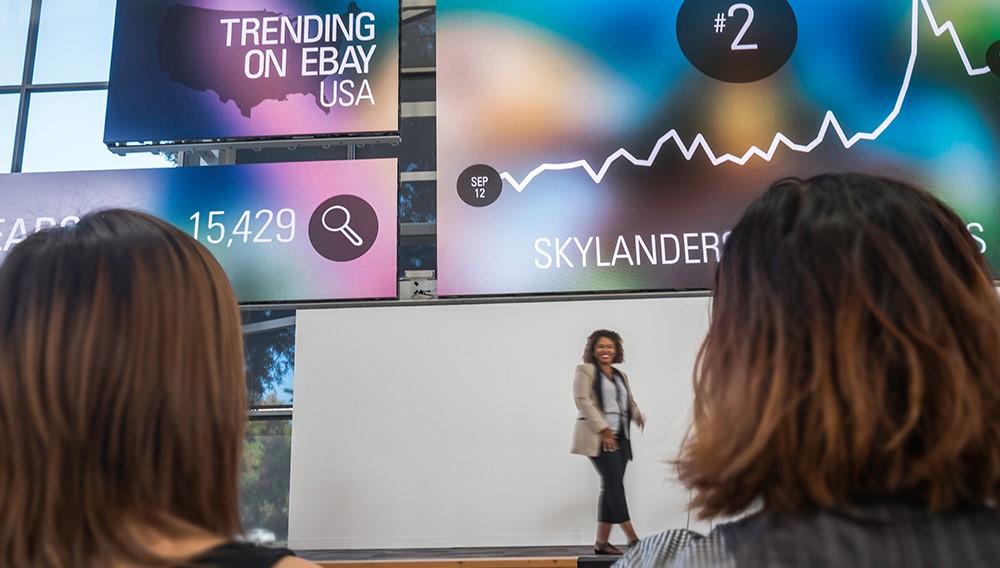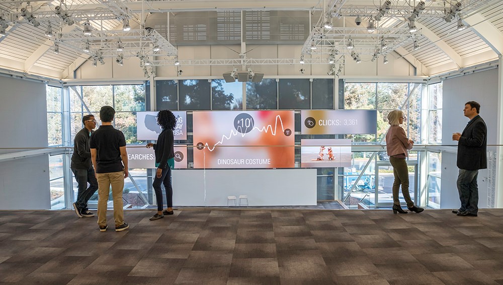 Main Street被设计了一套媒体互动装置。这款互动装置让访客沉浸在一个丰富的故事中,讲述公司庞大的用户群体和巨大的交易量。Main Street的中心是一堵15英尺高的触摸屏墙,用户可以通过它浏览eBay最近的交易。这种信息仪表盘和销售报价器的组合让员工看到他们构建的工具和他们所做的工作如何影响真实的人们的生活。