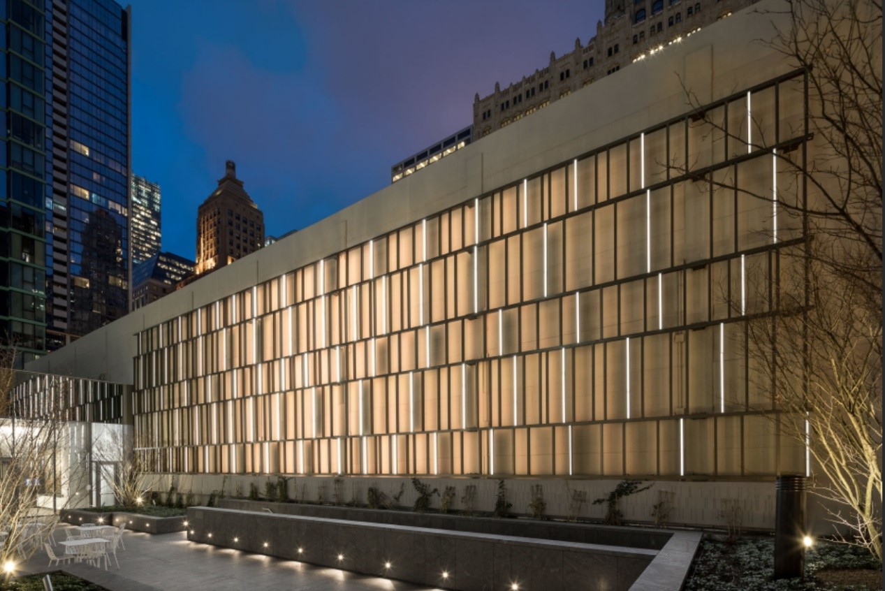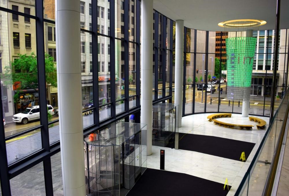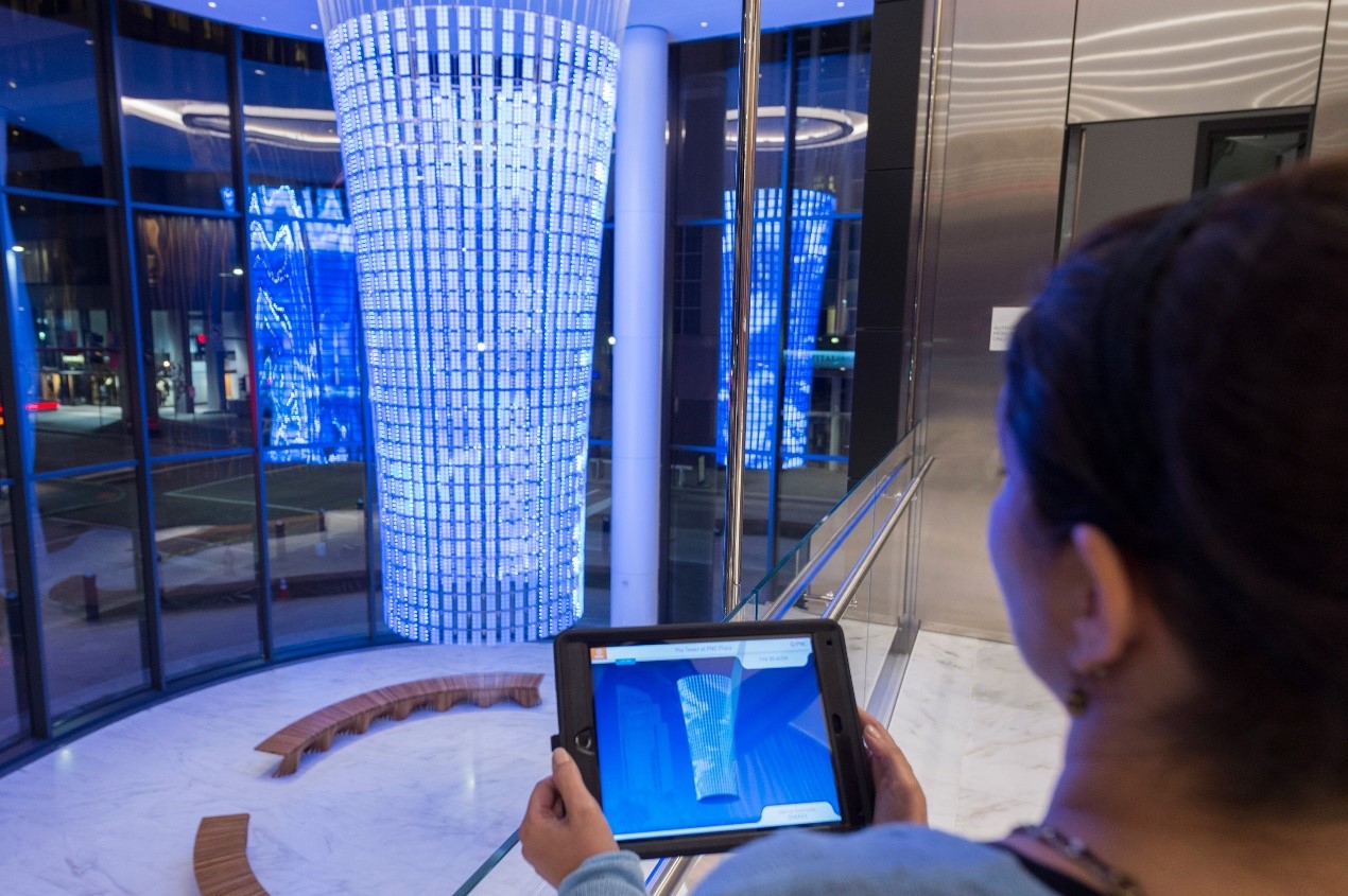匹兹堡PNC广场的塔楼就是这种趋势的一个值得注意的例子。这座塔是有史以来建造的最环保的高层建筑之一,其特点是有一个24英尺高的大厅,名为“灯塔”。这座枝形吊灯般的雕塑将来自建筑先进绿色系统的实时数据,以及天气、建筑占用率和阳光等当前环境条件,转化为不断变化的光线、颜色、文字和声音模式。