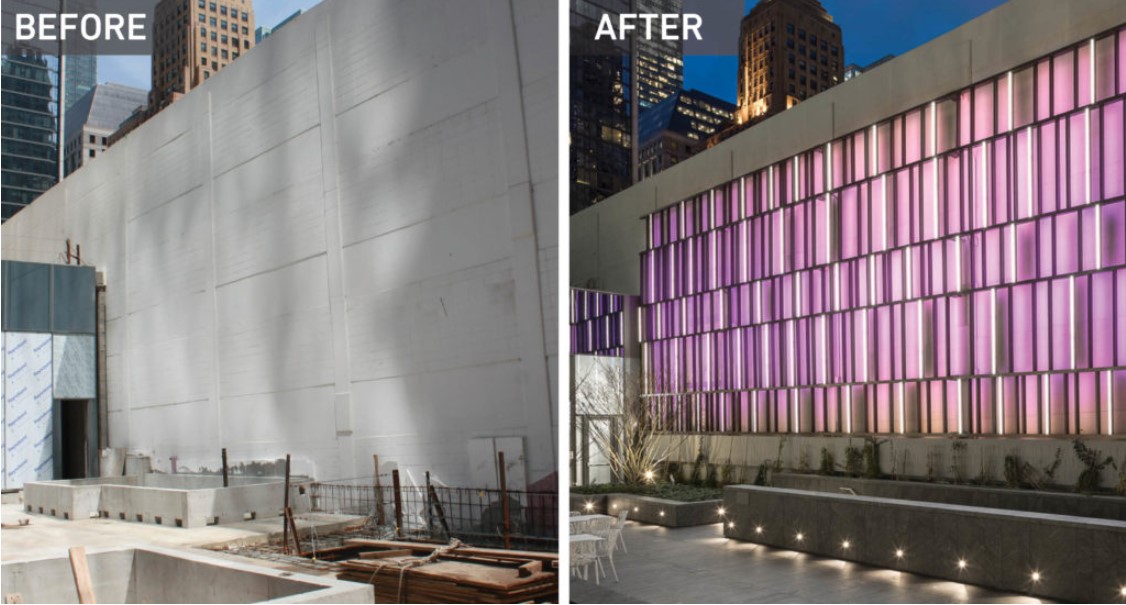 这是一个95英尺宽、25英尺高的轻艺术装置。它由一个普通的室外露台,与一个停车场的混凝土墙相连,并改造而成。现在已经成为芝加哥市中心的知名景观。
