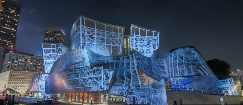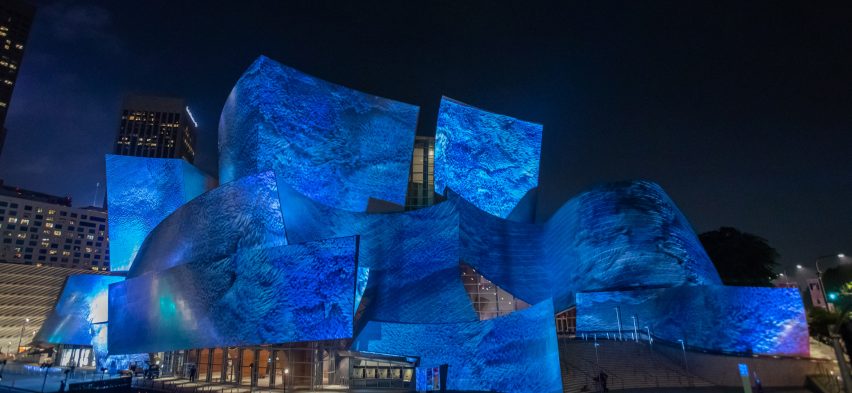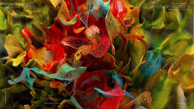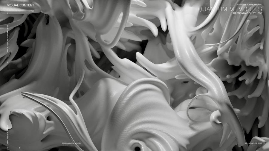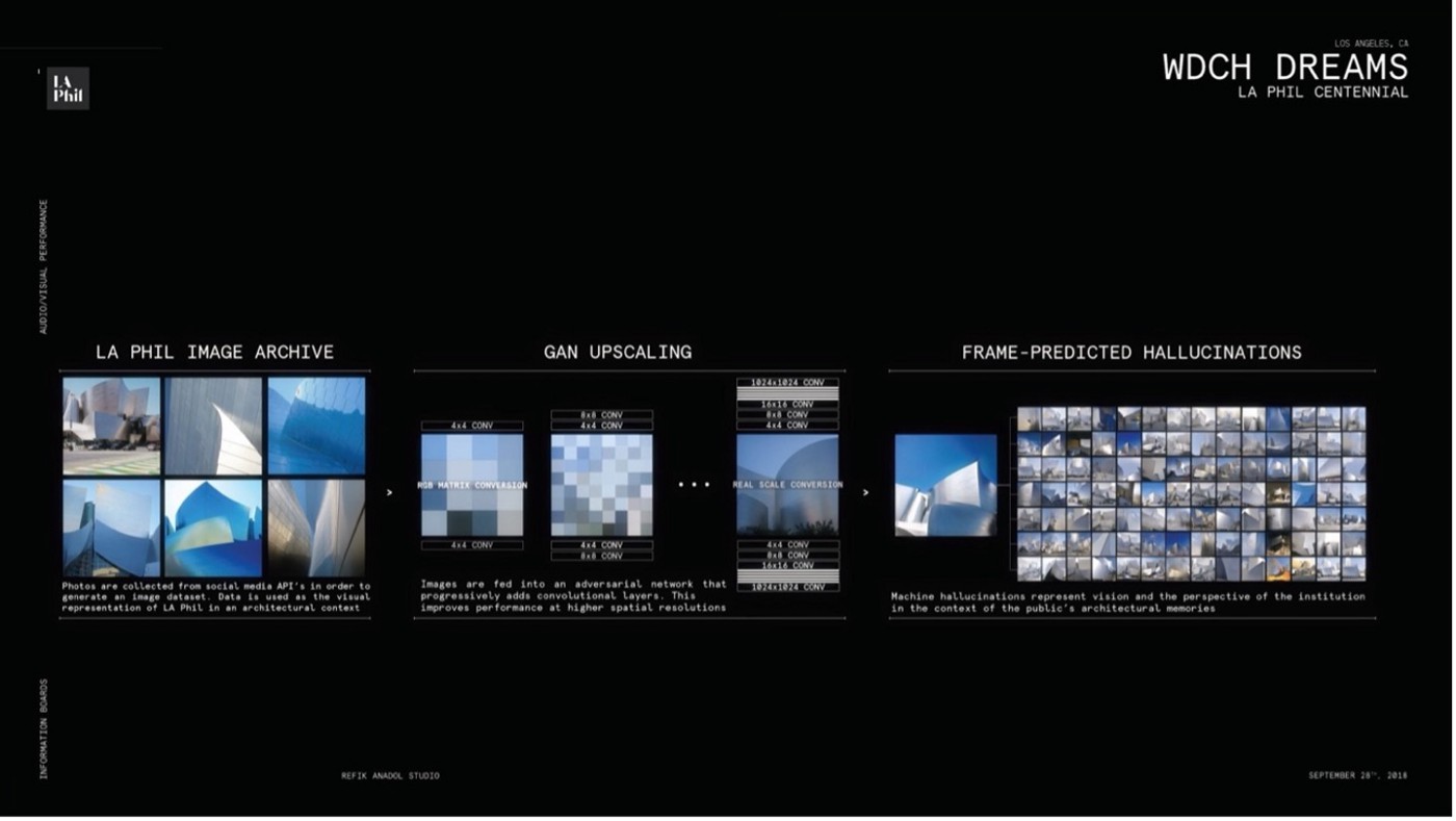 “Walt Disney Concert Hall(WDCH)Dreams Synametic architecture”是Refik Anadol于2018年创作的大型数据雕塑。在这部作品中,他使用了整个洛杉矶爱乐乐团数字档案中的参数数据——587763个图像文件、1880个视频文件、1483个元数据文件,和17773个音频文件,并使用机器学习算法,生成对抗网络(GANs)和卷积神经网络,将图像、音频和视频片段转换为新图像,他称之为“机器内存”。通过使用音乐厅历史上收集的图像训练神经网络,该网络可以聚合历史上的时刻和“幻觉”或自由联想,并生成馈入图像的变化。