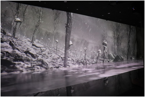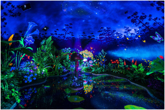 DMZ秘密森林是一个数字媒体展览,它有一个设计成士兵头盔状,形似营房的圆顶。展览呈现了一种宁静而神秘的氛围,展示了美丽的多媒体特效,比如飞舞的群蝶、绚烂的数字烟花。