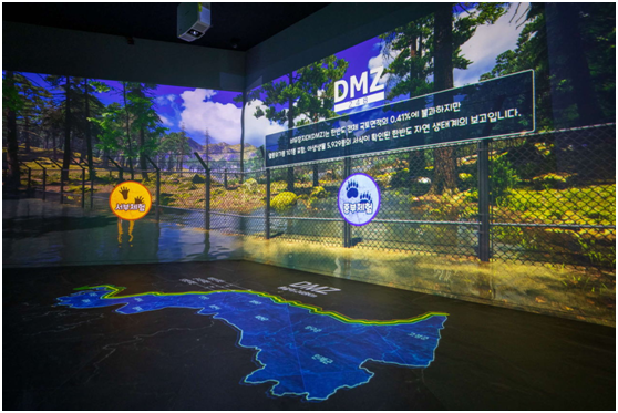 韩国旅游发展局和坡州市进行合作,利用虚拟现实(VR)和增强现实(AR)等技术,实现了文旅项目中的虚拟游览体验。体验馆分为一楼、二楼两个部分,一楼包括可以用虚拟现实(VR)在白翎岛等地旅行的“滑翔机”;将DMZ的四季在地板和墙面上沉浸式呈现的“数码四季”;查看DMZ附近的濒危动物物种、植物和各种生态资源的“秘密森林”等;二楼的影像馆,通过24米“L”字形的大型互动媒体墙,可以欣赏到真实感影像中充满魅力的DMZ景观,包括欣赏江原道的GoseongHwajinpo海浪,通过Geumgangsan,或者观测站的顶部观看Haegeumgang群岛的广阔景色等。