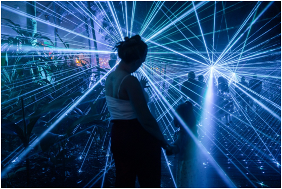 激光与大气交互,切割出神秘或欢快的氛围空间;
