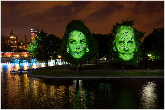 在四年里,老蒙特利尔的树木、建筑和鹅卵石街道将被一系列城市历史相关的投影影像照亮,这些影像与历史建筑相关联,每个装置的影像与历史建筑的结合颇具创意,游客可以发现、并开启若干的建筑投影装置,并像景点导览系统那样通过文字、音频等资讯感知城市的历史。