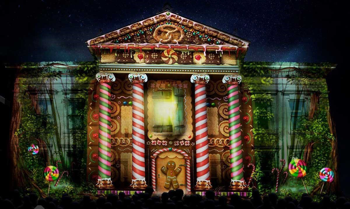 使用强大的投影仪、3D MAPPING 技术和三维动画技术,我们创造了一种视觉体验,巨大的结构正在转变,仿佛魔术一样,市政厅变成了姜饼屋,法院变成了巨石阵,光线与建筑互动,一切亦真亦幻。