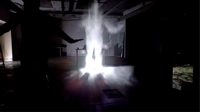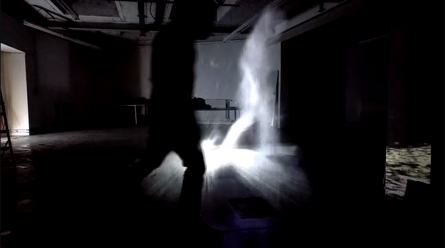 深度传感器和图像分析技术允许用户与投影内容互动,包括控制投出的各种空间几何图形的大小与位置,或者与投射出的虚拟形象进行互动。最终这个幽灵般的类全息图的投影艺术装置,创造出了一个可能会萦绕在你的梦中的幽暗体验。