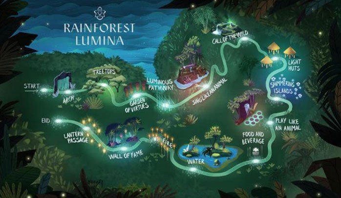 一旦你开始了这条小径,你将被介绍给动物伙伴,一群动物角色将引导你穿过整个小径。在整个热带雨林LUMINA小径和它的许多景点,你将与许多设施互动,走过美德花园、光明大道、闪闪发光的岛屿和名人墙,每一个都是一个不同的体验,,你会看到自己沉浸在整个冒险中,同时希望它永远不会结束。