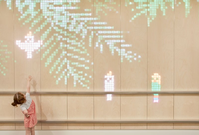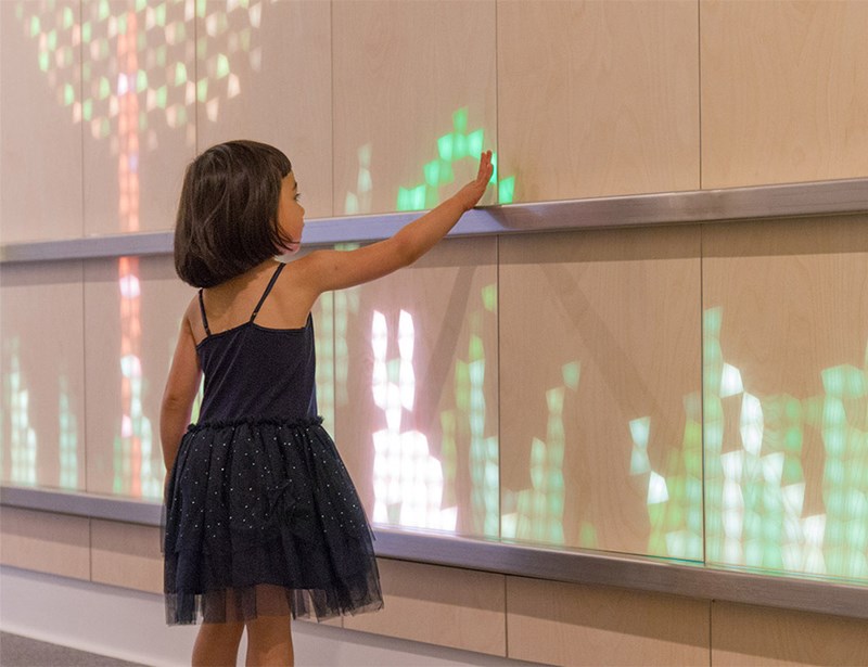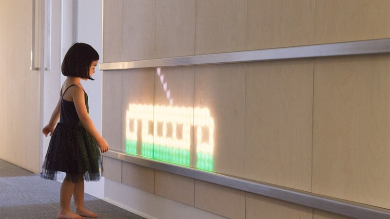 在儿科病房的入口处,梦幻般的图形让孩子和工作人员感到愉悦。儿童的肢体与墙壁的接触触发了风景动画和动物的运动,这使孩子们忘掉病痛。